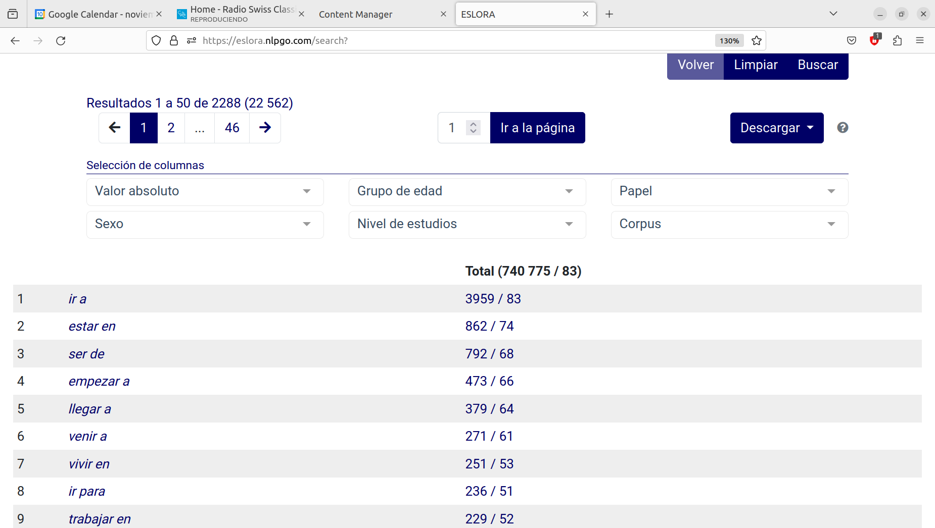 Este tipo de resultados puede ser fácilmente asimilado a los diccionarios de frecuencias léxicas producidos tradicionalmente, pero los resultados son de mayor utilidad en, al menos, dos aspectos distintos. En primer lugar, la posibilidad de obtener datos referentes a elementos gramaticales, como hemos hecho ya con los verbos de la segunda conjugación. Del mismo modo, es posible obtener la relación de combinaciones de dos preposiciones consecutivas o de verbos seguidos inmediatamente por una preposición. Para búsquedas de este tipo es necesario incorporar también la opción de elementos sucesivos (con el signo + situado en la parte derecha de la pantalla). De esta forma podemos obtener la relación de verbos que van seguidos inmediatamente por una preposición. Como es lógico, para que el resultado sea realmente útil es necesario dejar únicamente los lemas en la ventana de Agrupar.