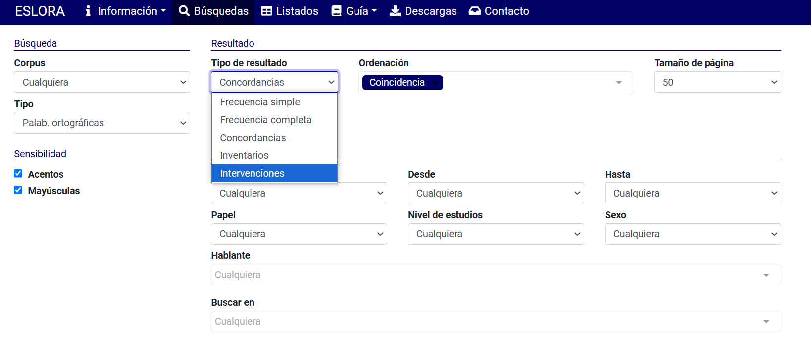 campo Tipo (vid. Descripción general del corpus, para más información) y, por otro, se seleccionan uno o