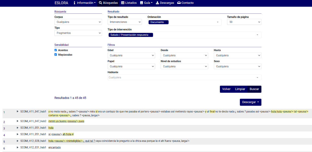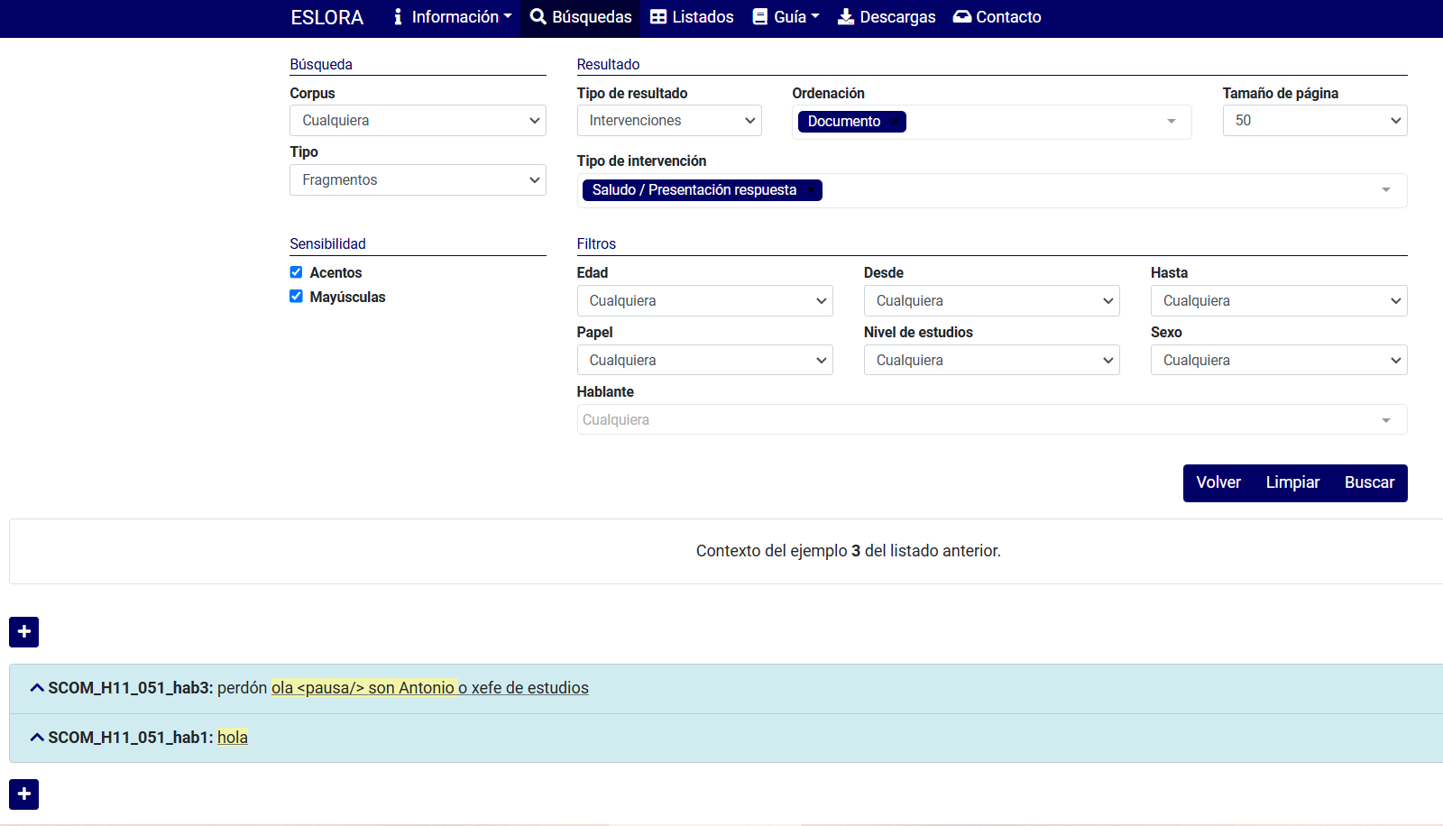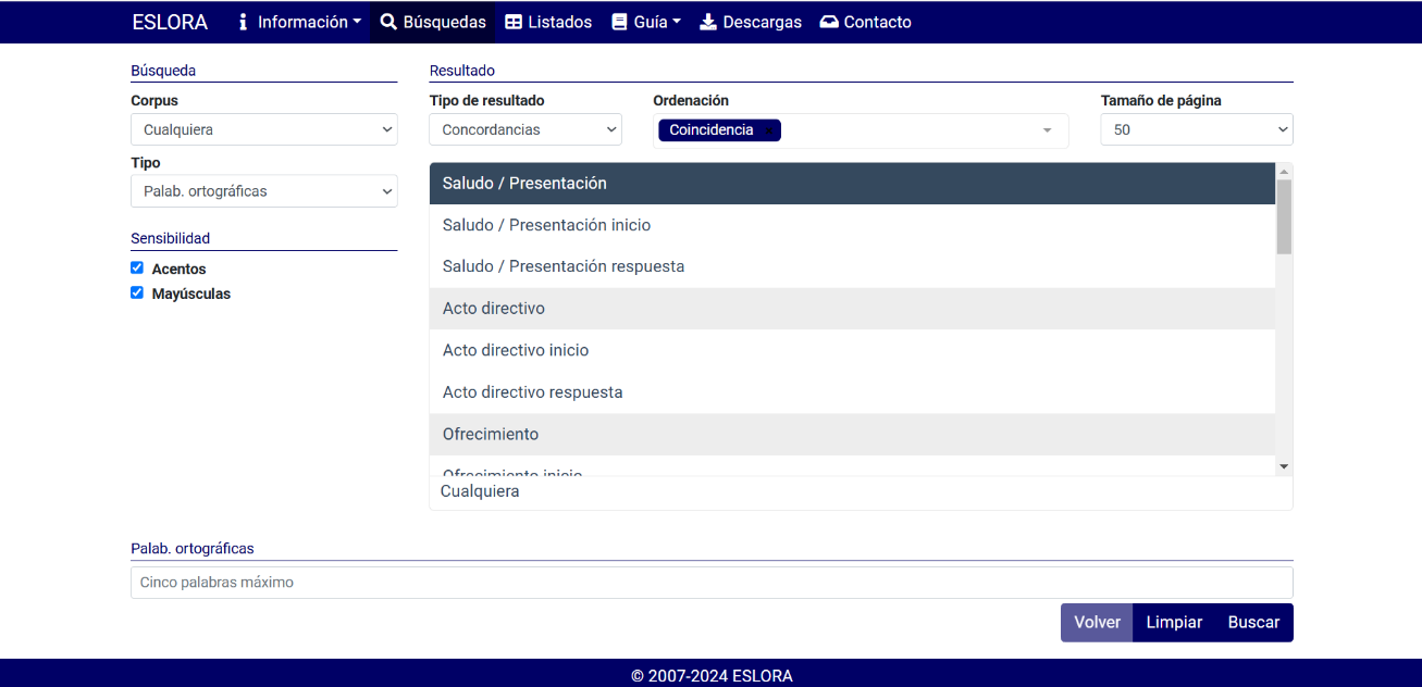 La aplicación de ESLORA ofrece dos posibilidades de búsqueda de actos de habla. La primera consiste en seleccionar