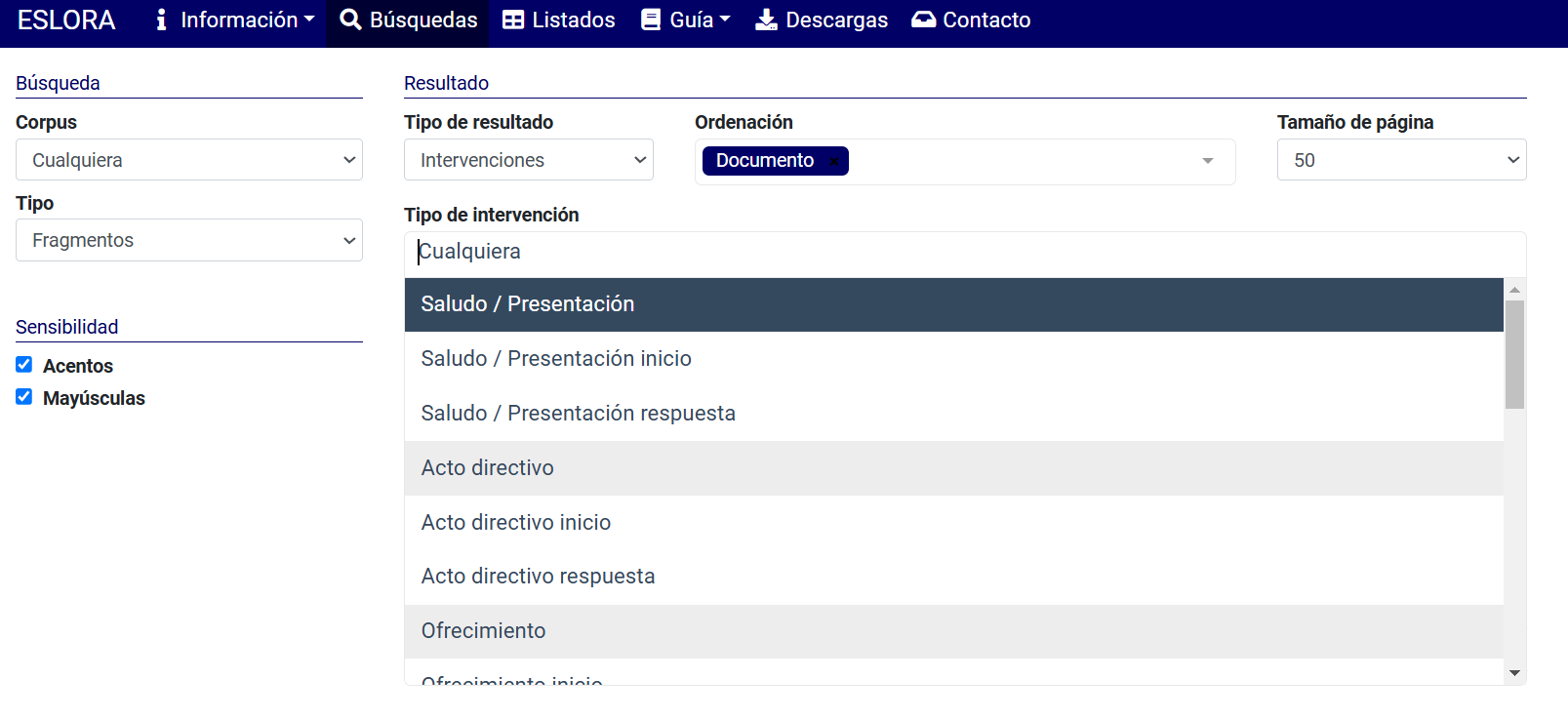 La aplicación de ESLORA ofrece dos posibilidades de búsqueda de actos de habla. La primera consiste en seleccionar directamente los actos en el listado de Intervenciones (vid. Fig. 1 y 2) y el sistema devuelve la totalidad de casos registrados; por ejemplo, todas las preguntas, todos los ofrecimientos, todas las respuestas a los ofrecimientos, etc. La segunda opción de búsqueda, situada en el campo Buscar en (vid. Fig. 3), permite establecer combinaciones entre actos de habla y otras unidades lingüísticas, como lemas, categorías, elementos gramaticales y palabras ortográficas; por ejemplo, ofrecimientos con el lema querer, con la forma quieres, con un verbo en imperativo, etc.