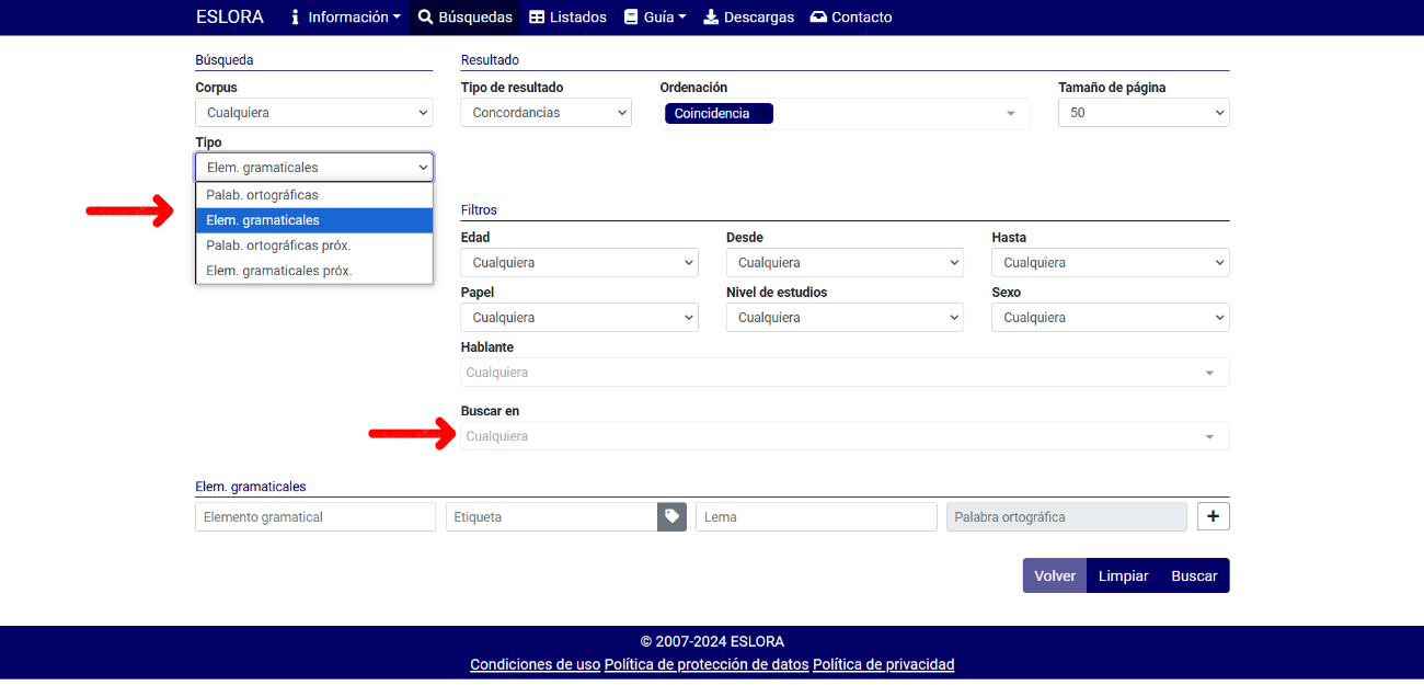 Este tipo de búsqueda permite obtener casos en los que una o más palabras ortográficas, elementos gramaticales, categorías o lemas se emplean con un acto de habla determinado o con varios. Por un lado, se escoge una opción en el campo Tipo (vid. Descripción general del corpus, para más información) y, por otro, se seleccionan uno o varios actos de habla, o constituyentes, en el desplegable Buscar en, como se indica a continuación en las fig. 3 y 4: