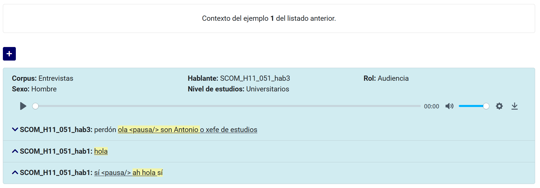 Al clicar en el número de un ejemplo, se accede a un mayor contexto, que se amplía aún más pulsando en los signos + situados por encima y debajo (vid. Fig. 6). También es posible obtener más información sobre los hablantes, así como escuchar y descargar el audio del ejemplo seleccionado haciendo clic en el símbolo ^ situado a la izquierda (vid. Fig. 7).