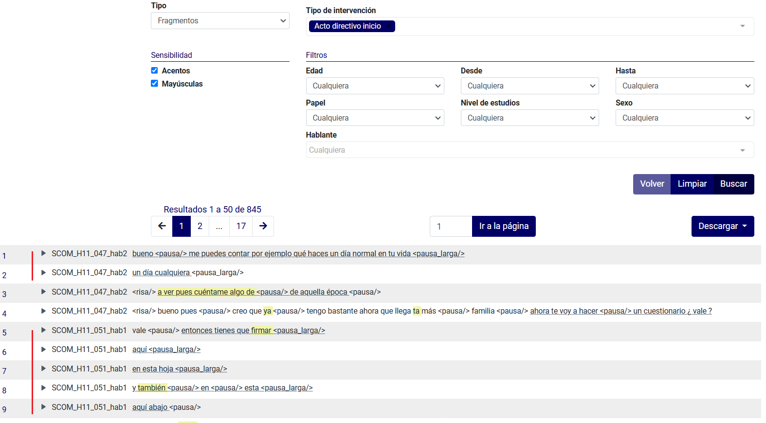 Al realizar una búsqueda de actos de habla o de actos combinados con unidades lingüísticas, la aplicación devuelve un inventario de los casos correspondientes, que se pueden descargar en un documento de Excel o fichero CSV, seleccionando la opción Descargar. Al igual que en las búsquedas gramaticales, es posible acceder al audio clicando en el símbolo play que aparece a la izquierda cada ejemplo (cf. Fig. 5). Los fragmentos resaltados en amarillo contienen alguna etiqueta del inventario general del corpus –v.g., alargamiento, turno solapado, nombre ficticio, palabra cortada, etc.–, que se identifica acercando el puntero a las zonas destacadas (vid. Descripción general del corpus, para más información).