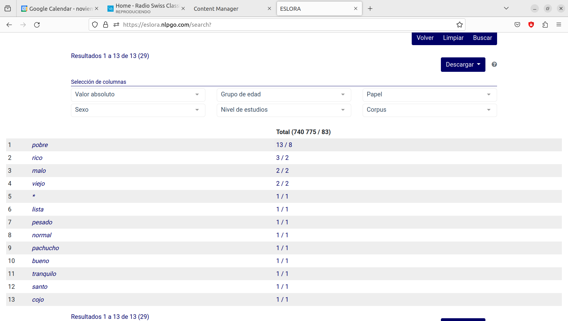La segunda novedad importante consiste en la posibilidad de obtener directamente la relación de formas ortográficas, elementos gramaticales o lemas distintos que tienen ciertas características, con indicación de la frecuencia de cada uno. En las versiones anteriores era posible obtener, por ejemplo, el número total de adjetivos terminados en -iño, -iña, -iños, -iñas, así como la frecuencia total y normalizada o la distribución en los diferentes parámetros presentes en el corpus de los elementos de este tipo. Sin embargo, llegar a la lista de elementos únicos con esta característica (es decir, la lista de adjetivos diferentes que se documentan con este diminutivo y la frecuencia de cada uno de ellos) requería reordenar primero las concordancias obtenidas y hacer luego el recuento de los elementos distintos de forma manual. No es un trabajo excesivo con elementos de este tipo (29 casos en total), pero la tarea resulta mucho más pesada si el objetivo es, por ejemplo, obtener la lista de verbos de la segunda conjugación presentes en el corpus con la frecuencia total de cada uno de ellos.